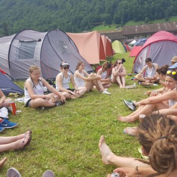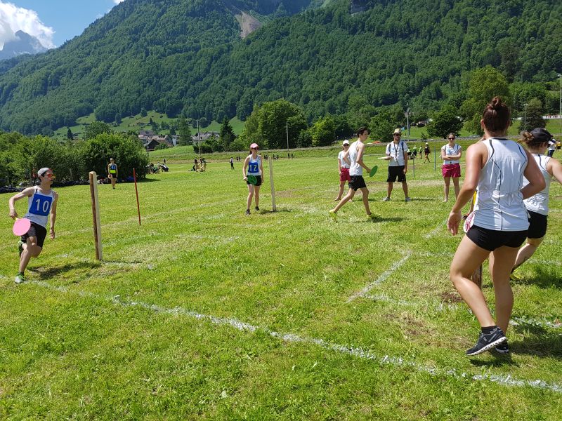 Bereits beim Aufbau wurden unter dem stahlblauen Himmel einige Schweissperlen verschüttet und erinnerten uns an unsere bevorstehende Herausforderung. Nach einer emotionalen Rede unserer Oberturnerin und mit gestärktem Teamgeist ging es an die erste Disziplin –der Pendelstaffete über 80 Meter. Mit einer Durchschnittszeit von 10.8 Sekunden konnten wir perfekt in den Wettkampf starten und holten gleich unsere beste Note, eine 8.51. Nach einer kurzen Verschnaufpause kam die zweite Disziplin, nämlich der Fachtest Allround. Starker Wind, brennende Sonne und etwas Pech hinderten uns leider an unserem gewohnten Punkteerfolg und so mussten wir dort die schlechteste Note, eine 7.27, hinnehmen. Nichtsdestotrotz ging es topmotiviert an die nächste und letzte Disziplin –Leichtathletik. Angesagt waren Kugelstossen, Weit- und Hochsprung und 800m Lauf. Hervorragende Leistung aller Beteiligten führten mit einem 8.30 zu unserer zweitbesten Teilnote.