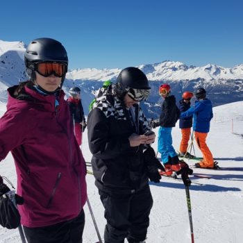 Nach der dritten Abfahrt nahm die Hälfte dieser neun schon mal die falsche Abzweigung, aber der modernen Kommunikation sei Dank fanden wir nach einer halben Stunde wieder zusammen. Nun wurde alle Stunde gewissenhaft durchgezählt: Alle da, es kann weitergehen! In flottem Tempo fuhren wir Piste um Piste ab und genossen tolle Aussichten im schönen Gebiet. Kurz vor Mittag auf der Aroser Seite angekommen, peilten wir die Mittagsbeiz an – Burger sollten es sein, die Sit-Hütte war unser Ziel. Im Schatten auf der Sonnenterrasse genossen wir feines Essen, leider war die Musik dazu eher auf bescheidenem Niveau. In Arosa war Elektronik-Festival, nicht gerade unser Geschmack. So machte sich die eine Hälfte bald wieder auf zum Schneespass, die andere Hälfte hatte Schlagerspass, direkt vom Zmittag in die KuhBar sollte es gehen!